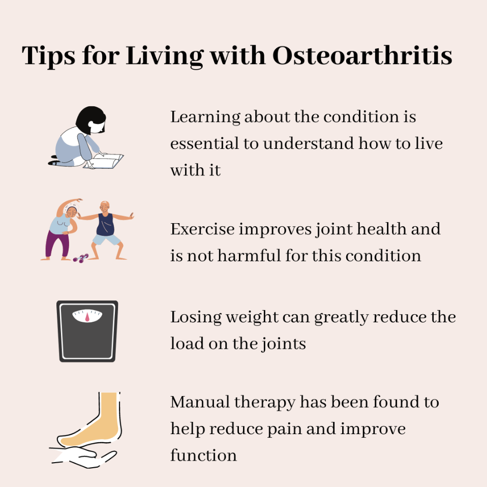 Education. The more you know about OA, the better you will be able to live with it and care for yourself. Seeking out help from a health professional is an important step when managing this condition. A health professional can give you guidance and information that you need to live a better quality of life.